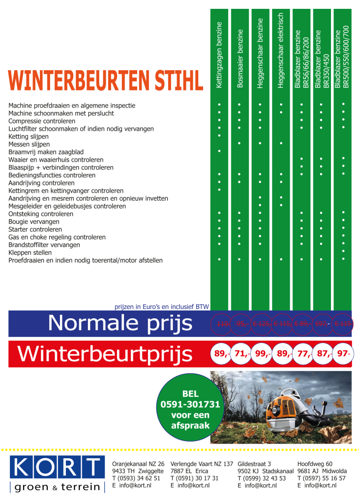 Kort Groen & Terrein is leverancier van professionele machines voor bos-, berm-, sloot-, tuin-, park- en terreinonderhoud en is tevens het adres voor onderhoud, reparaties en keuringen. Hoewel alles ook leverbaar is vanuit Zwiggelte, Midwolda en Stadskanaal, heeft Kort Groen & Terrein als basis de vestiging Erica, met een winkel met o.a. tuin-en park machines, kettingzagen, bladblazers, heggenscharen, zitmaaiers, hogedrukreinigers en bosmaaiers. In Erica wordt ook het onderhoud aan deze machines gedaan en hebben we naast een uitgebreide tuin-en park winkel ook een aparte afdeling in de werkplaats voor onderhoud en reparaties aan tuinmachines. Kort Erica is erkend STIHL dealer.