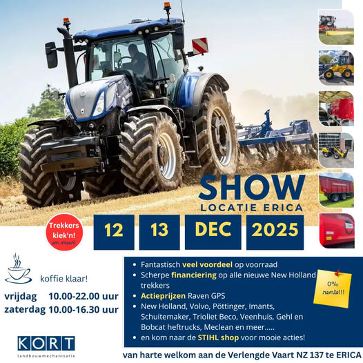 Op 12 en 13 december bent u van harte welkom op onze locatie te Erica. Aan de Verlengde Vaart NZ 137 te Erica tonen wij u een breed assortiment van nieuwe en gebruikte machines van gerenommeerde merken. New Holland, Volvo, Gehl, Schuitemaker, Beco, Pöttinger en Imants om maar eens wat te noemen! Daarnaast kunt u de Stihl shop bezoeken en het Meclean plein en in de horeca hoek staat verse koffie voor u klaar!