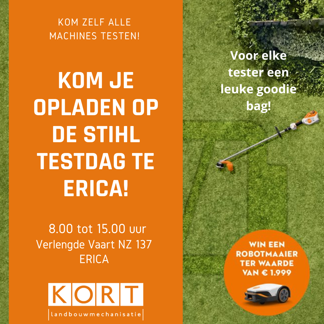 Op zaterdag 13 april is het weer de landelijke STIHL testdag. KORT Erica doet hier ook aan mee! Op deze dag kunt u tal van machines zelf uitproberen in voorbereiding op het tuinseizoen. Twijfelt u nog wat u nodig heeft? Kom dan naar Erica en probeer de machines zelf! Voor elke tester is er een leuke goodiebag!