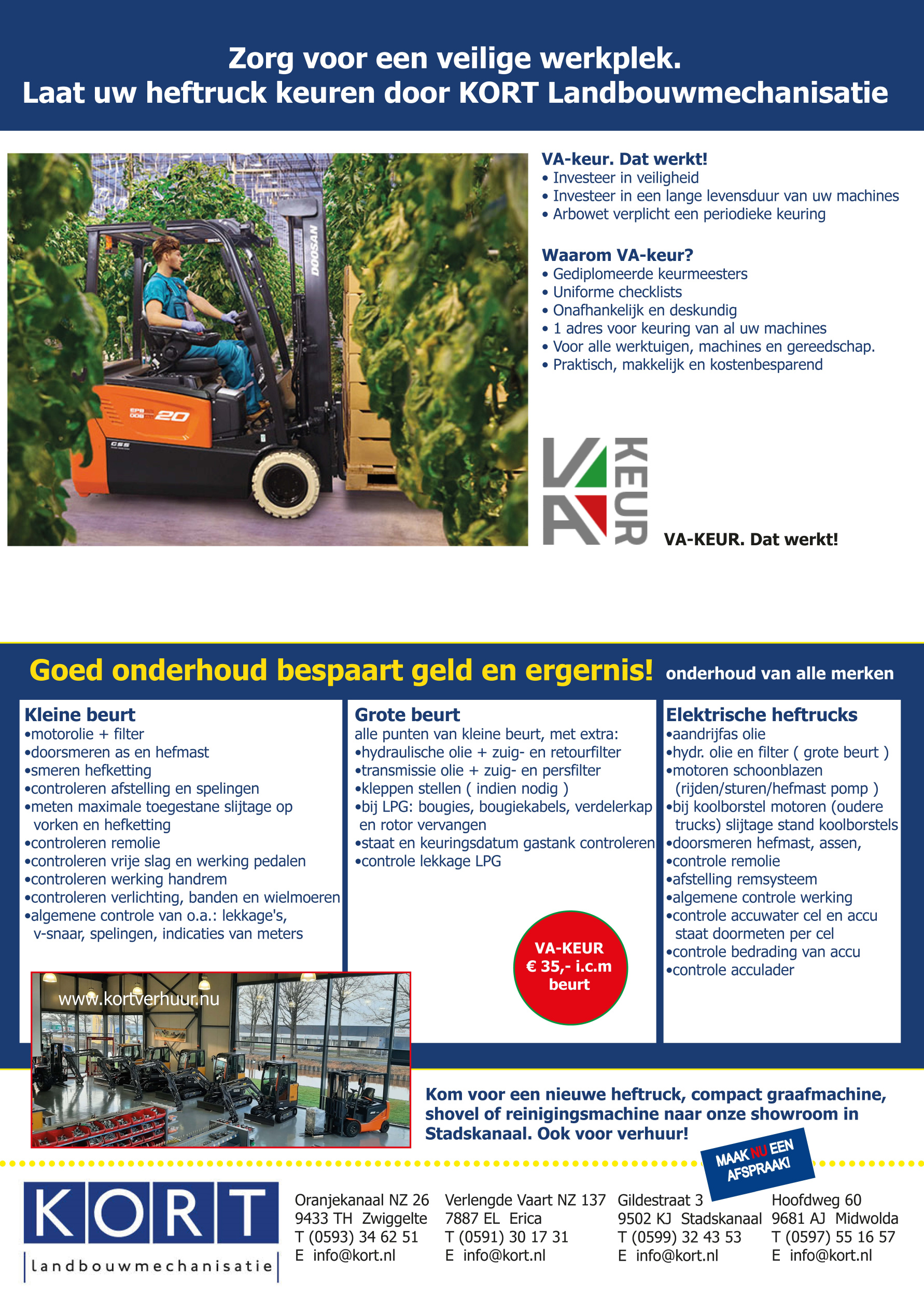 Zorg voor regelmatig onderhoud, en laat uw heftruck door ons keuren. De arbowet schrijft periodieke keuring voor, en deze kunt u door onze gediplomeerde VA-keurmeesters laten uitvoeren.